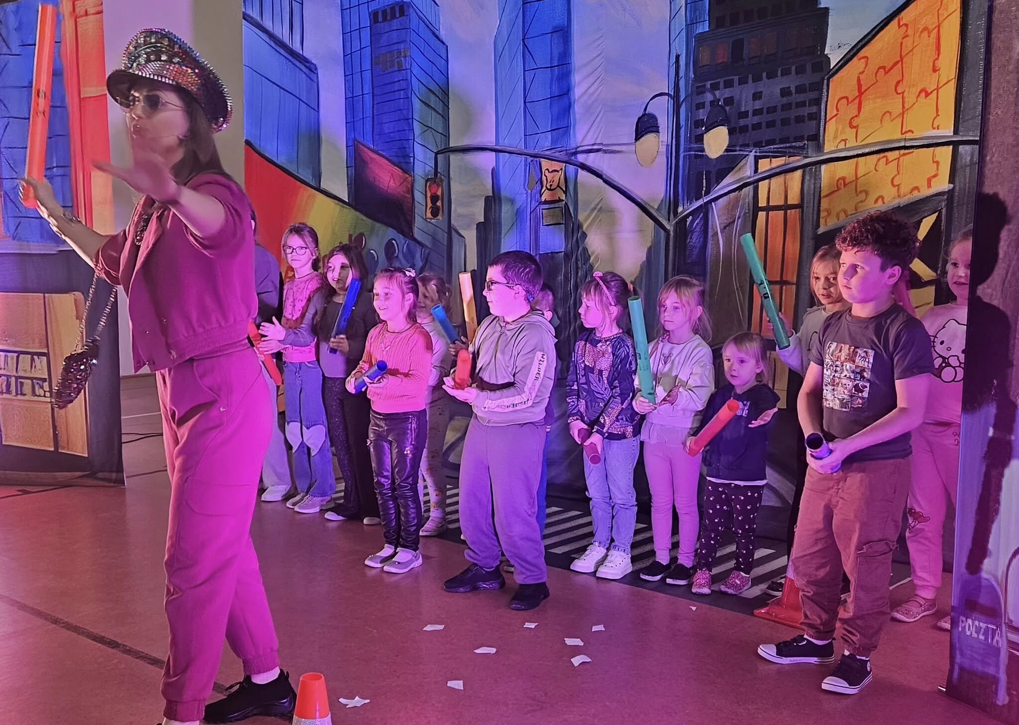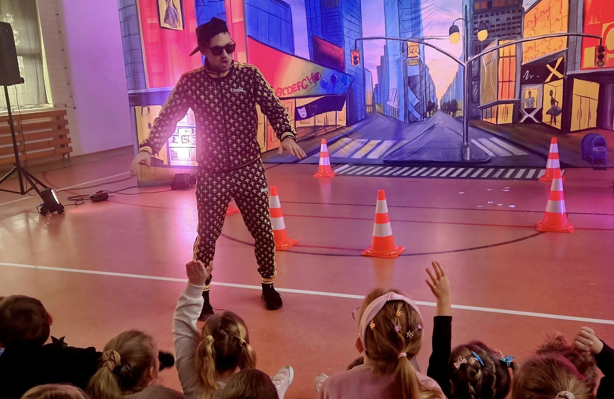 Spektakl miał charakter interaktywny. Dzieci zapraszane były na scenę, gdzie aktorzy sprawdzali ich wiedzę na temat zasad ruchu drogowego. Postać Odrzutowego Gienia uczyła dzieci prawidłowego poruszania się po drodze.