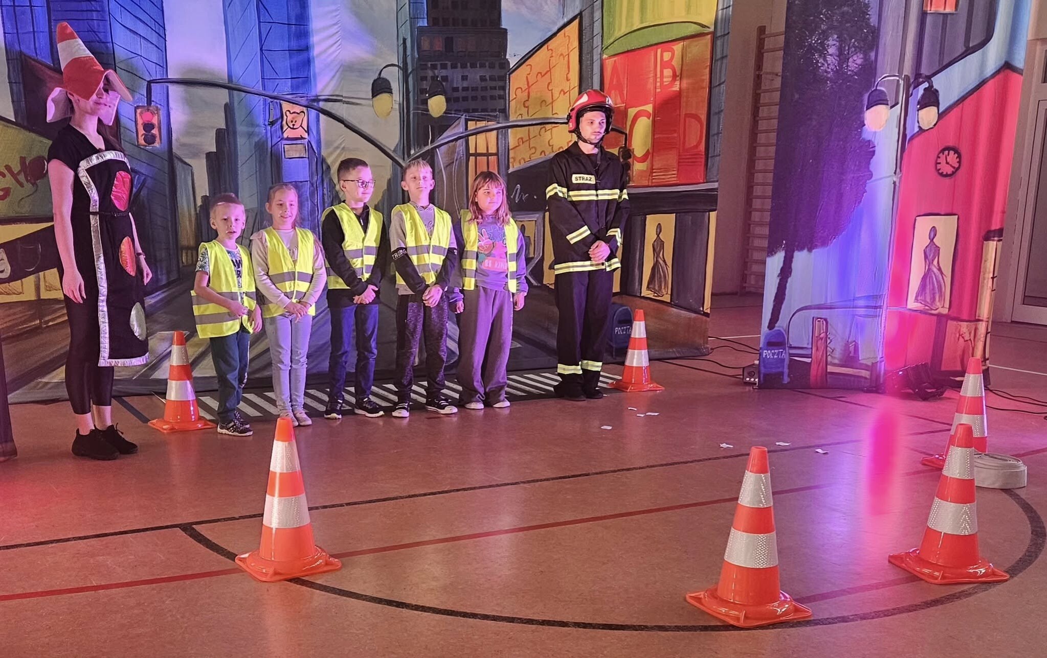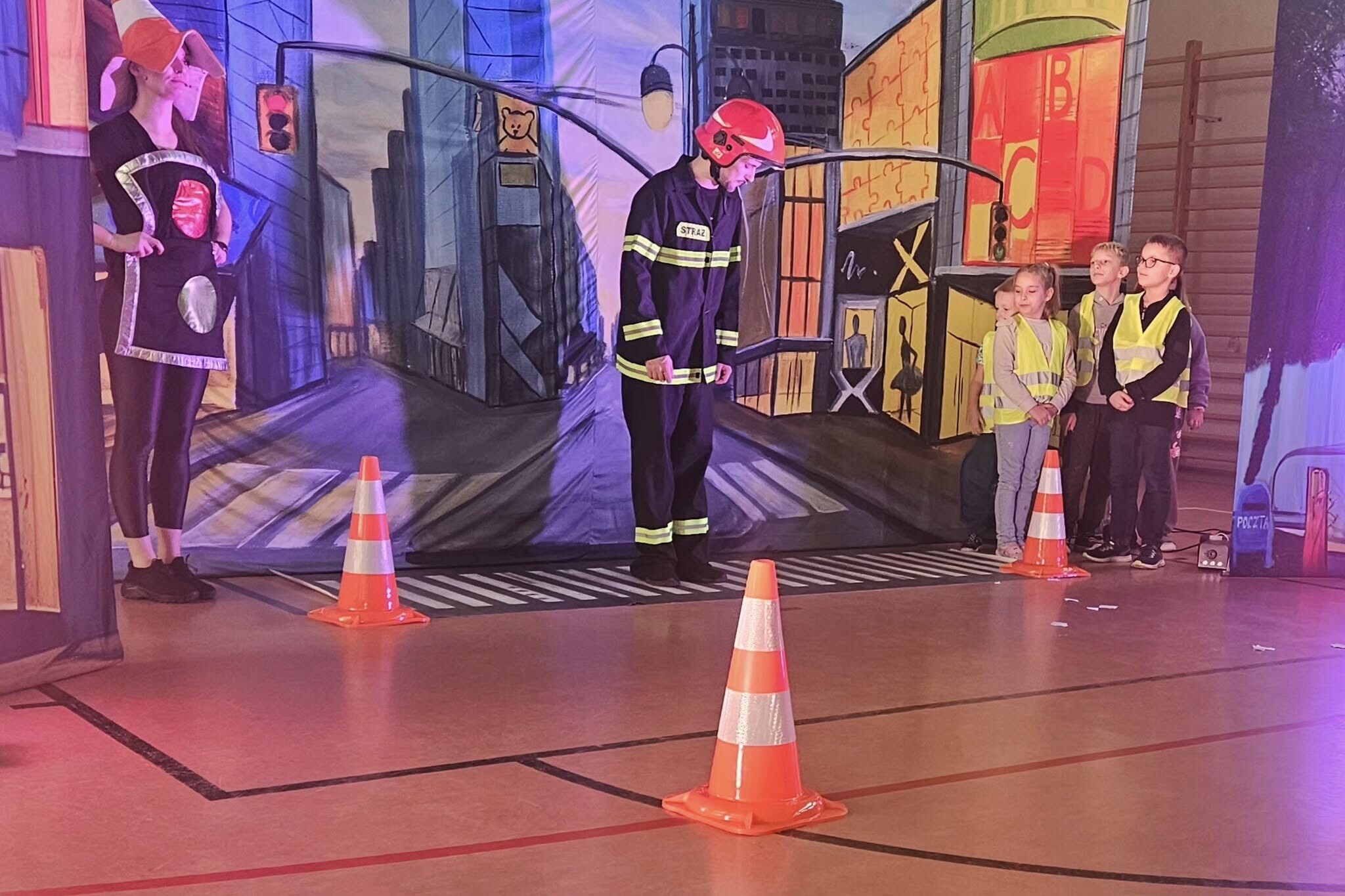 Podczas przedstawienia dzieci poznały numer alarmowy 112, zobaczyły akcję strażaka, a Pan Policjant wraz z Wiolettą z Wydziału Ruchu Drogowego pokazali im, jak prawidłowo przechodzić przez ulicę.