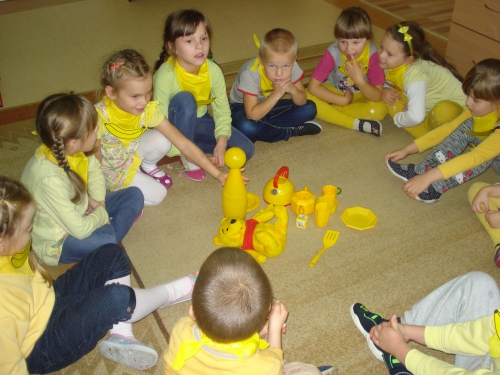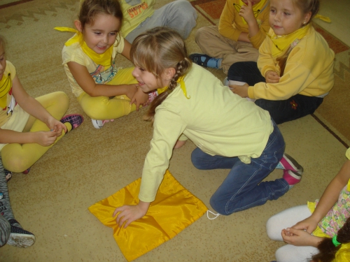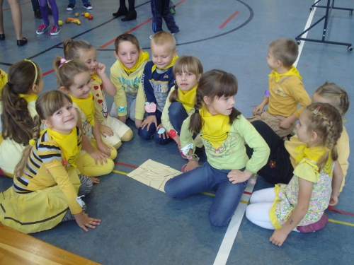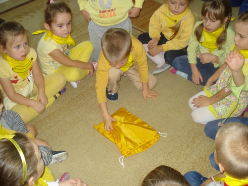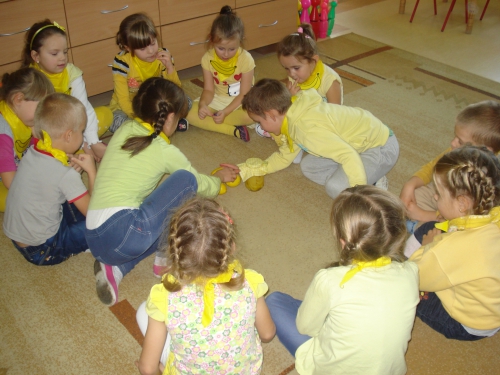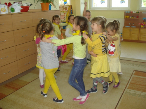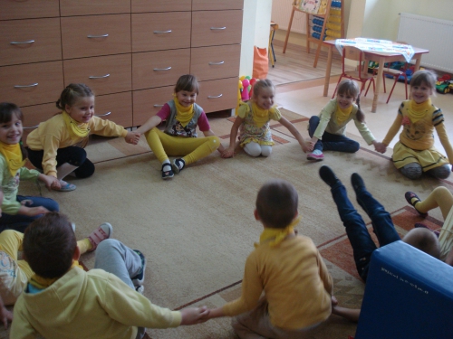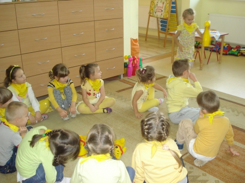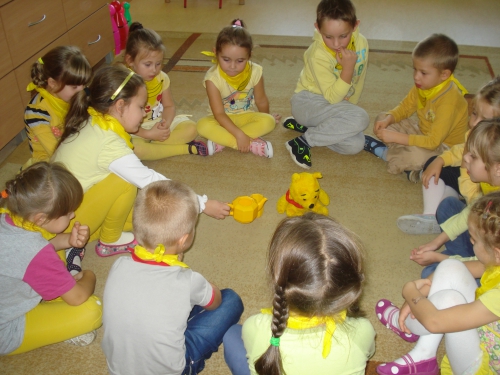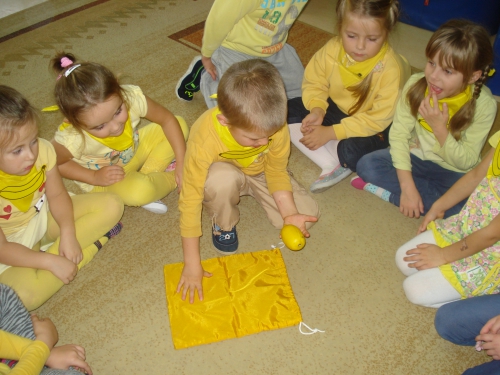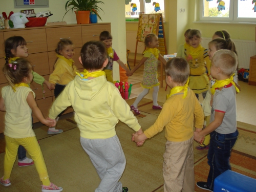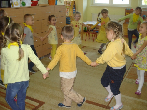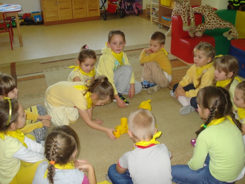 Z kolei szukaliśmy w sali żółtych przedmiotów i kładliśmy je w stworzonym przez nas kole. W ten sposób powstał całkiem duży zbiór żółtych rzeczy.