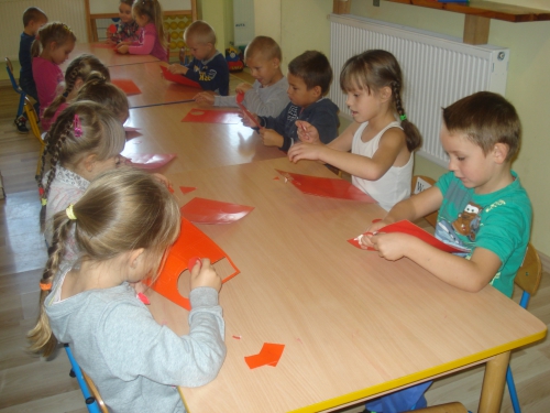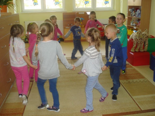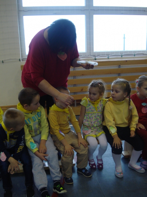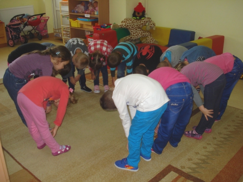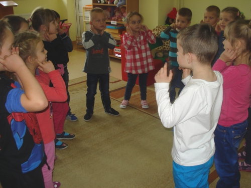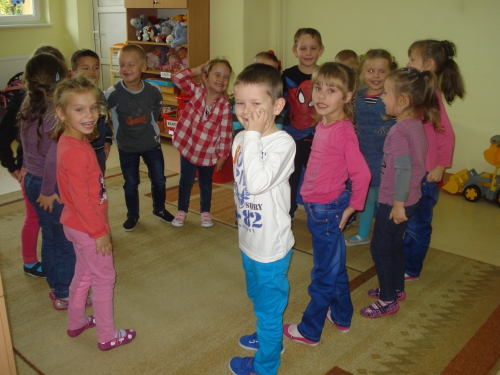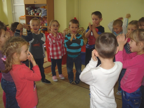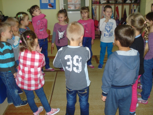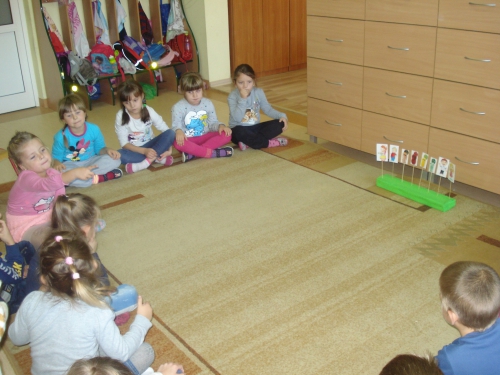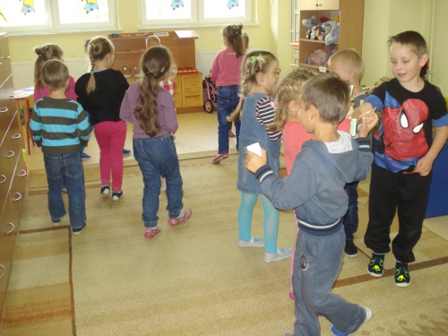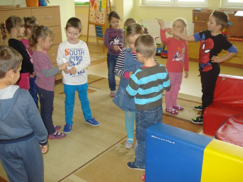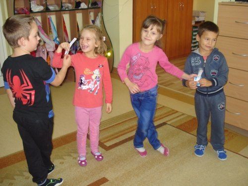 Pani rozdała nam sylwety kubeczków lub szczoteczek do mycia zębów. Na komendę "Szczoteczka do kubeczka" musieliśmy dobrać się w pary.