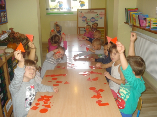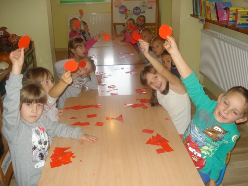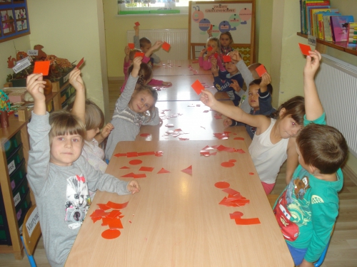 Następnie pokazywaliśmy nad sobą poszczególne figury geometryczne: koła, kwadraty, trójkąty oraz prostokąty.