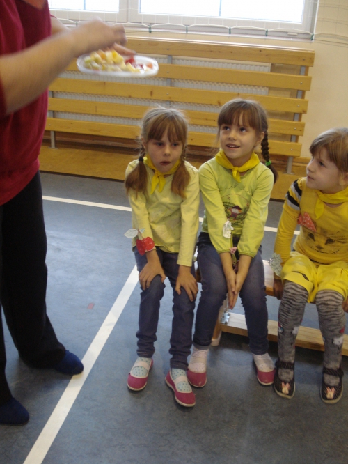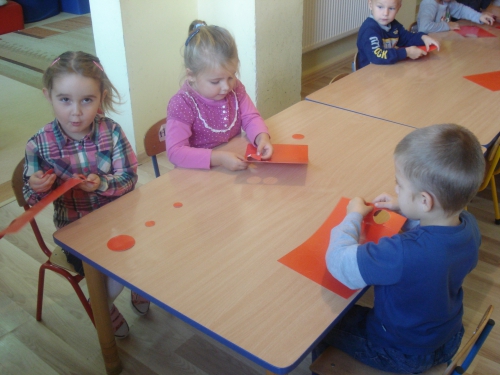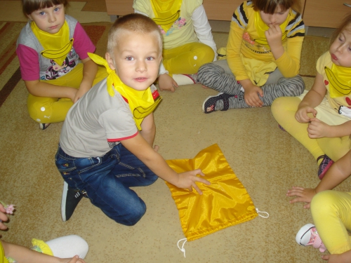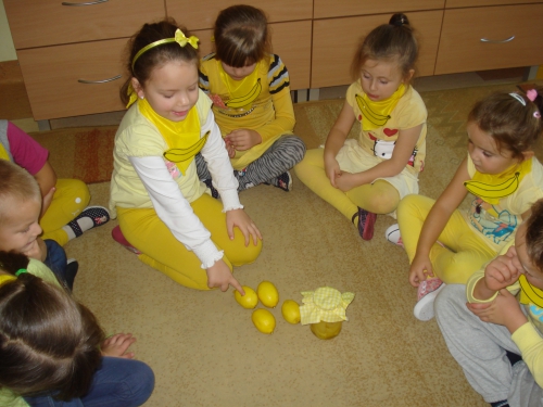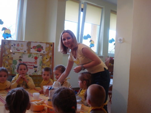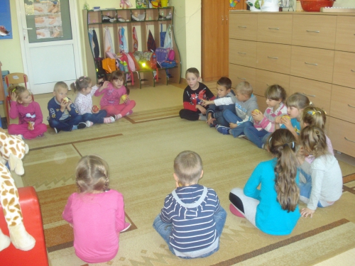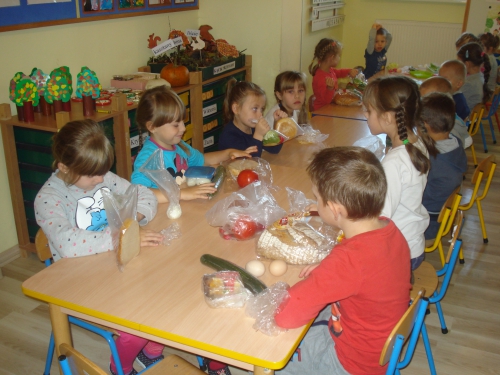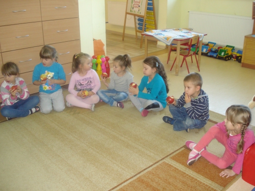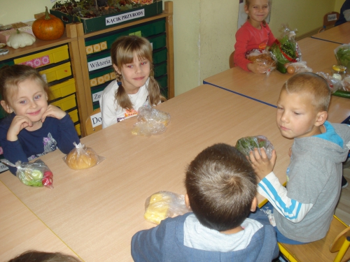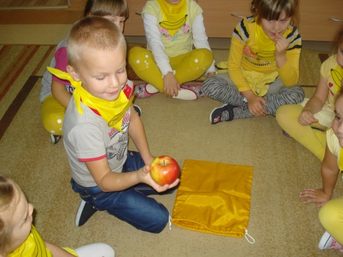 Na koniec pani chowała w worku owoce, które my dotykaliśmy przez worek i odgadywaliśmy ich nazwy.