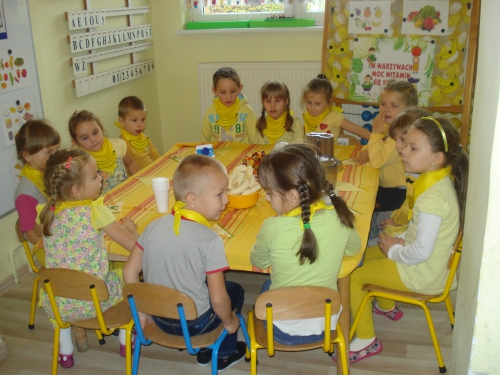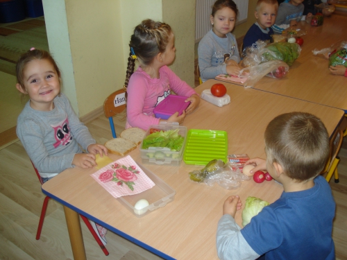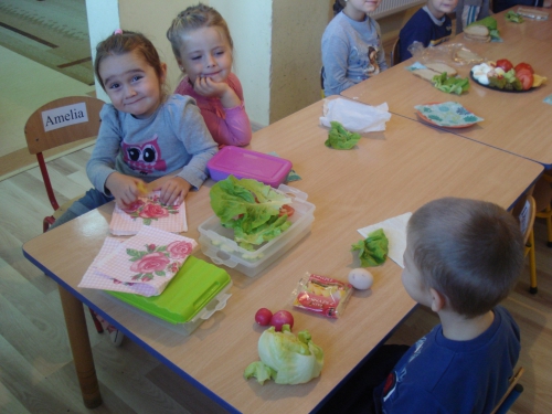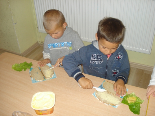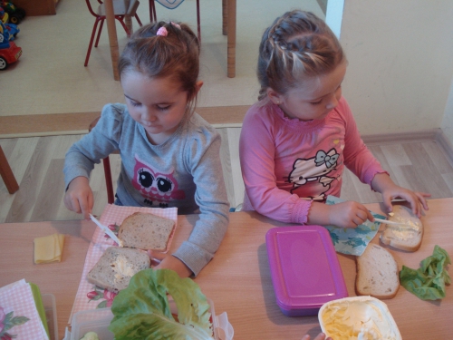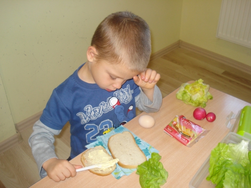 Nasza pani pokroiła warzywa, jajka i ser oraz umieściła je na talerzach. W tym czasie my rozłożyliśmy kromki chleba na serwetkach i przyglądaliśmy się wykonywanym przez panią czynnościom. Ze zniecierpliwieniem czekaliśmy na moment, kiedy zaczniemy smarować chleb masłem.