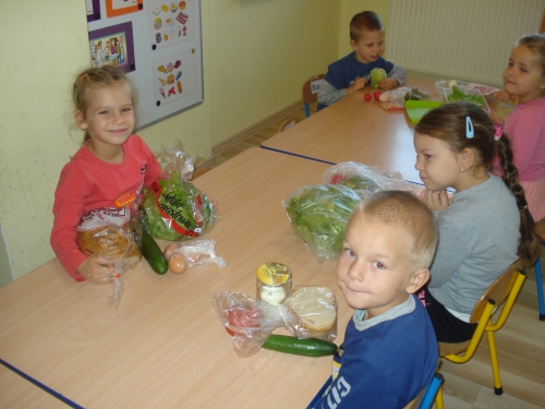 Następnie wyjaśniliśmy sobie znaczenie właściwego odżywiania się i rozpoczęliśmy wykonywanie zdrowych kanapek. Zaczęliśmy od pokazu przyniesionych przez nas produktów spożywczych i nazywania ich.