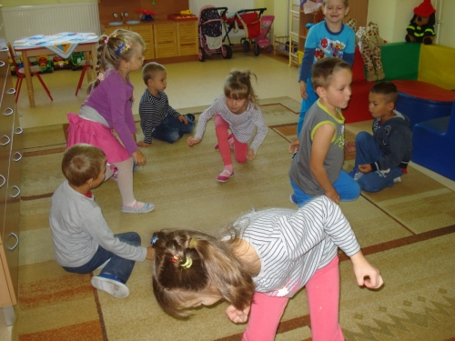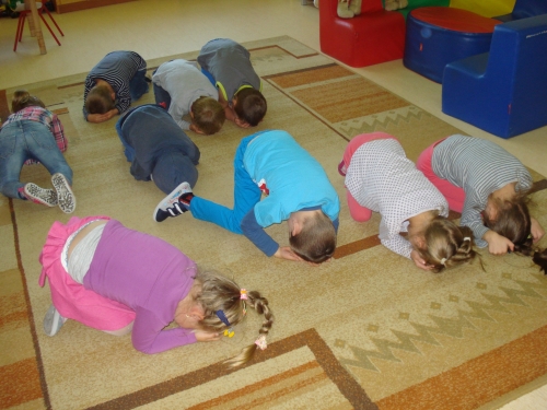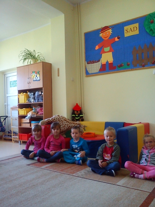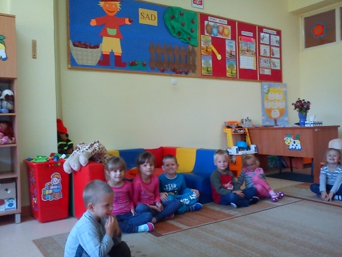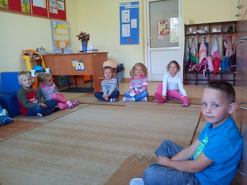 Przygotowujemy się do zajęć na dywanie prowadzonych przez naszą panią. Jak zwykle jesteśmy weseli i uśmiechnięci.