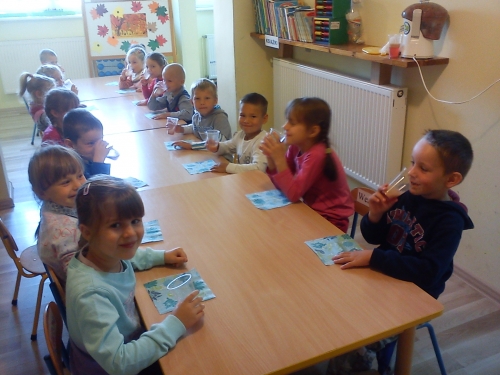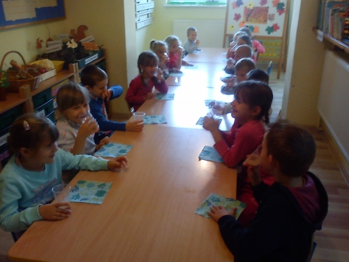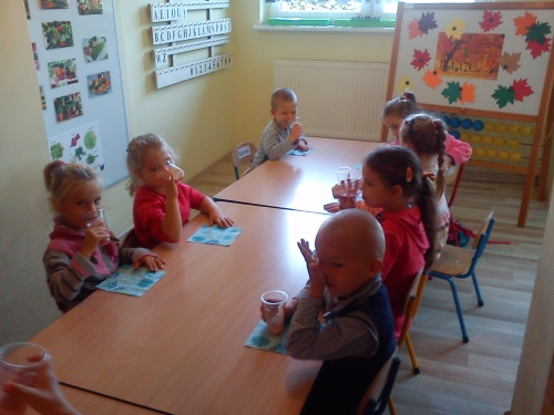 Po zakończeniu pracy plastycznej znaleźliśmy również czas na zrobienie i spożycie soku jabłkowego. Jabłka przynieśliśmy z sadów naszych rodziców i dziadków. Sok był wyśmienity!