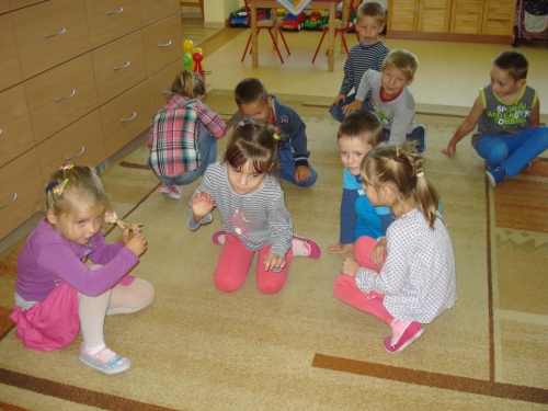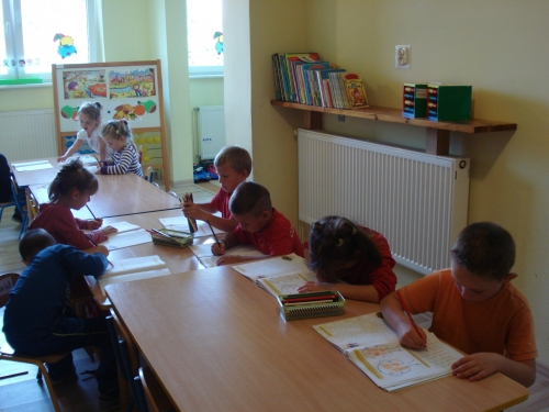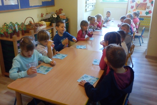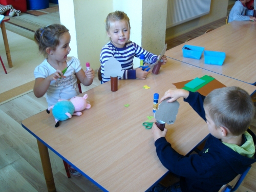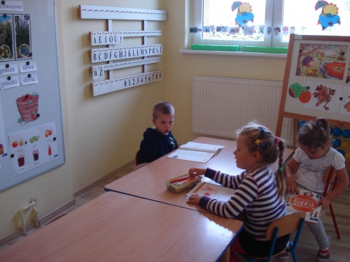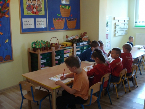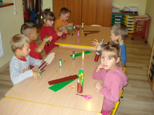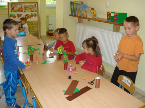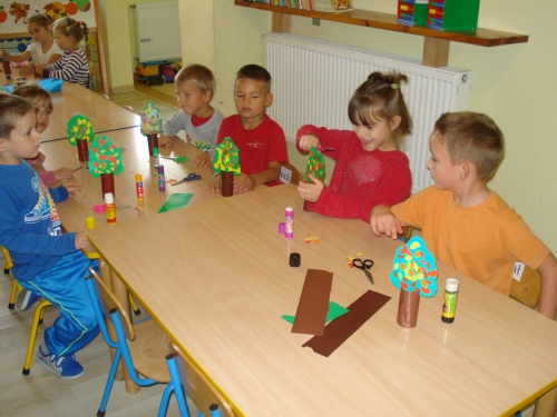 Znów nadszedł czas na pracę przy stolikach, ale tym razem jest to praca plastycza. Każdy z nas wykonuje swoje drzewko owocowe: śliwę, gruszę lub jabłoń.