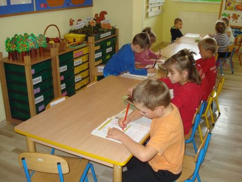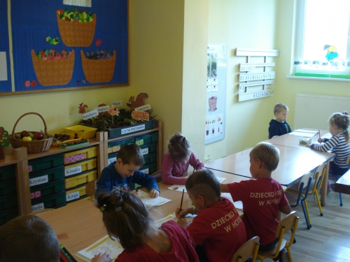 Nasze jabłonie, grusze i śliwy postawiliśmy na półce obok kącika przyrody, a sami zabraliśmy się do rysowania po śladzie.