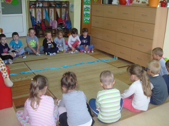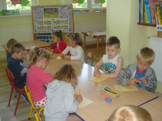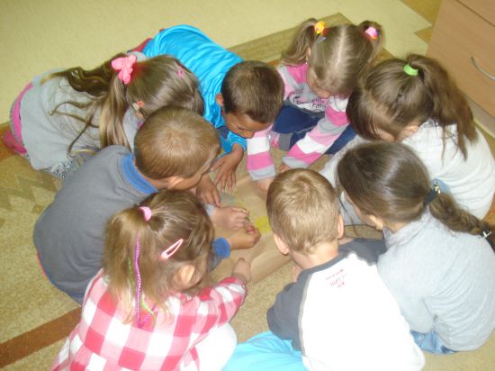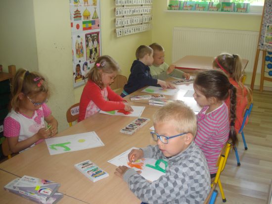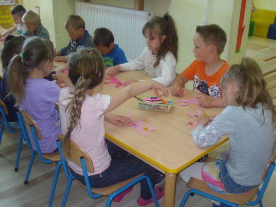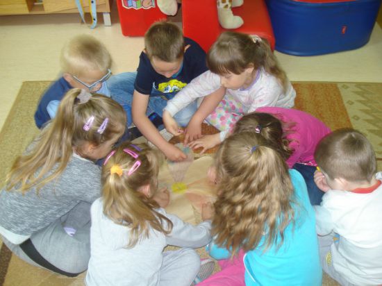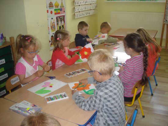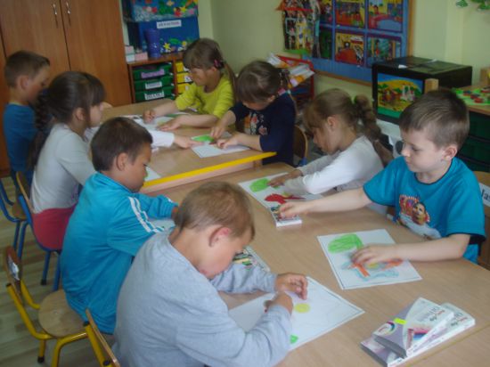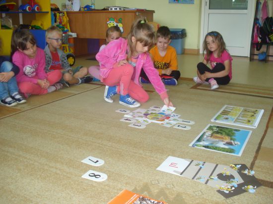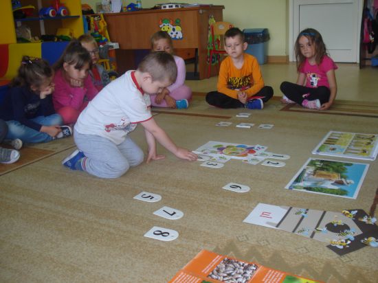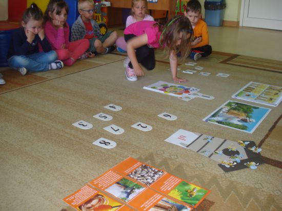 Liczyliśmy płatki wiosennego kwiatu oraz na każdym z nich umieszczaliśmy sylwetę pszczoły. Następnie liczyliśmy je według kolejności. Poznaliśmy również etapy powstawania miodu oraz dowiedzieliśmy się, na czym polega praca pszczelarza.