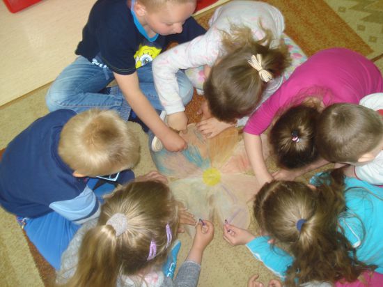 W dwóch ośmioosobowych grupach wykonaliśmy kwiaty madali. Każda grupa usiadła wokół papierowej sylwety kwiatu i przy dźwiękach spokojnej muzyki kolorowała wspólnie płatki kwiatu.