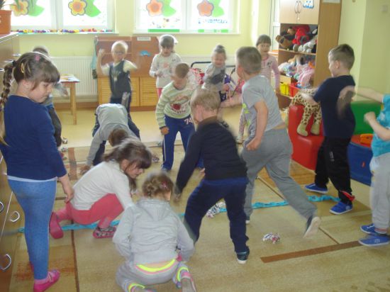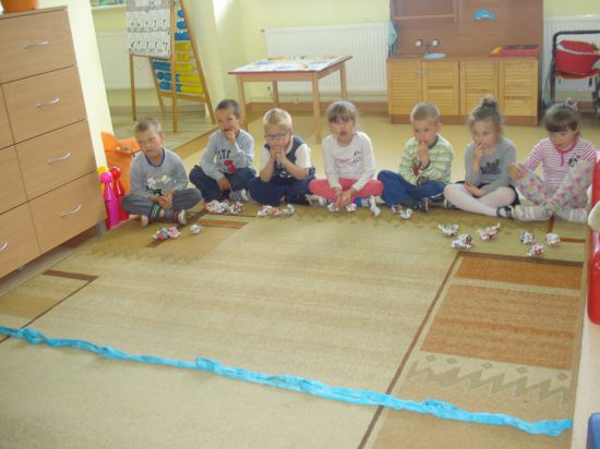 Bawiliśmy się w zabawę ułatwiającą rozładowanie napięcia "Latające kule". Podzieleni na dwie drużyny uformowaliśmy z gazet papierowe kule. Później na sygnał przerzucaliśmy je na stronę przeciwnej drużyny. Wygrywała ta grupa, która po sygnale zakończenia zabawy miała na swojej połowie mniej kul.