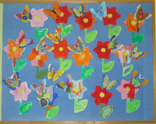 Kolorowaliśmy i wycinaliśmy sylwety kwiatów rosnących na naszych podwórkach i w naszych ogrodach. Na każdym kwiatku umieściliśmy również barwnego motylka.