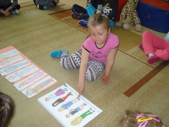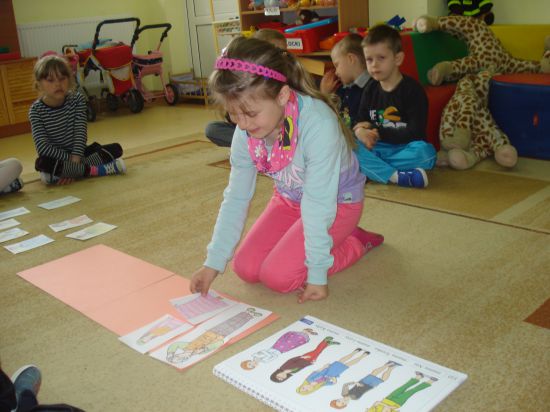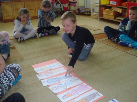 Dobieraliśmy do siebie połowy sylwet kobiet i mężczyzn oraz opisywaliśmy ich wygląd. Wskazywaliśmy również na tablicy demonstracyjnej mamy pasujące do opisu czytanego przez Panią.