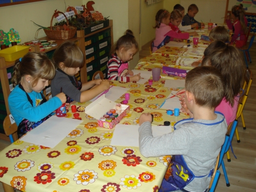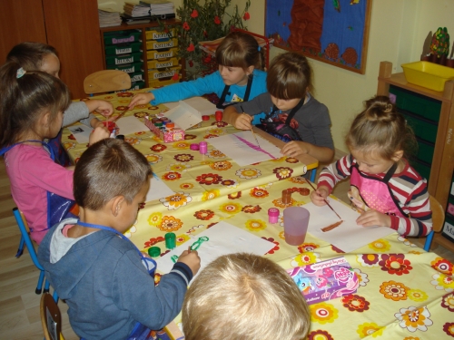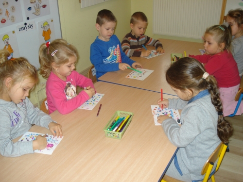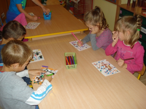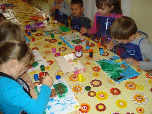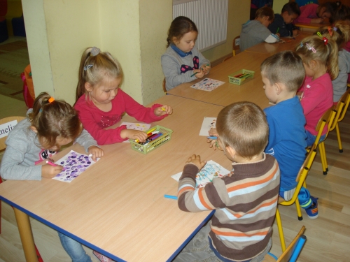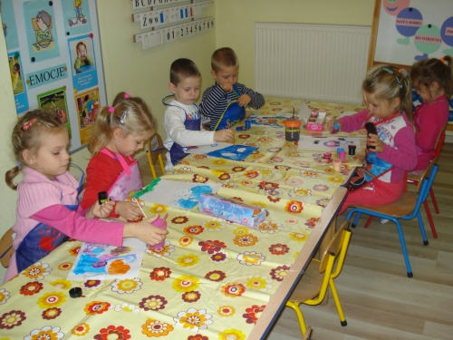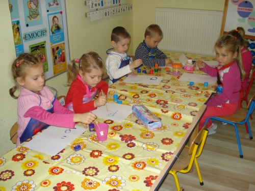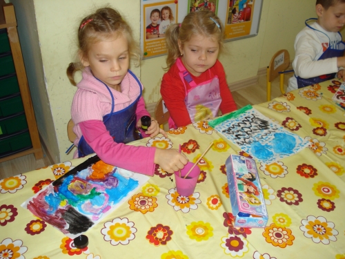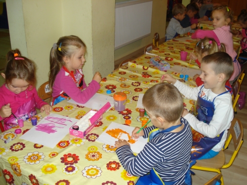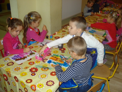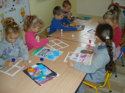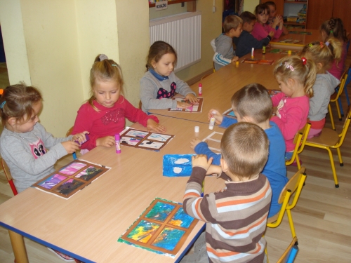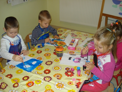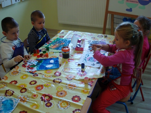 Gdy farba wyschła, obrysowywaliśmy odciski, tworząc rybki, ptaszki oraz inne zwierzątka. Stworzyliśmy bardzo ciekawe kompozycje.