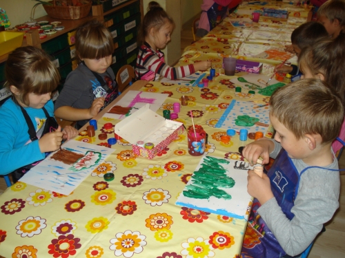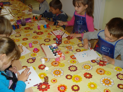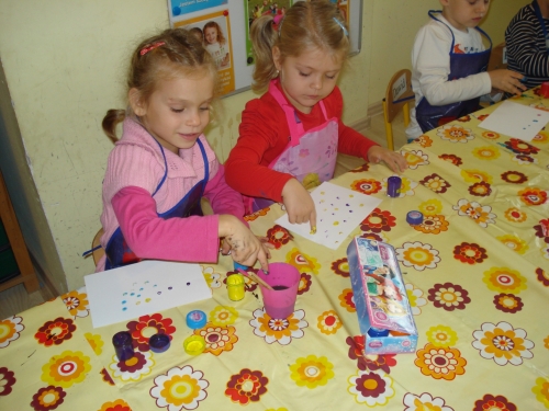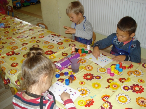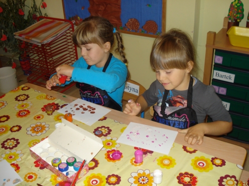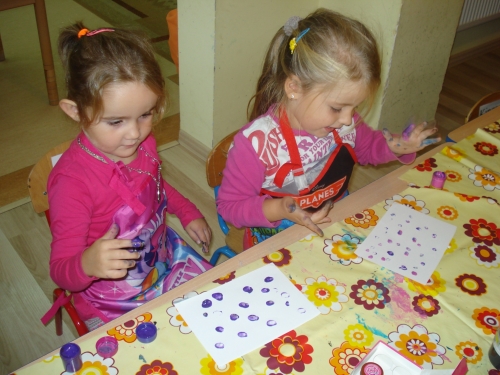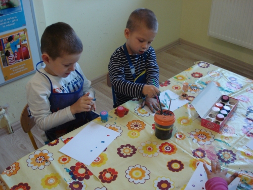 Moczyliśmy opuszki palców w farbie i odbijaliśmy odciski na kartkach z bloku technicznego.