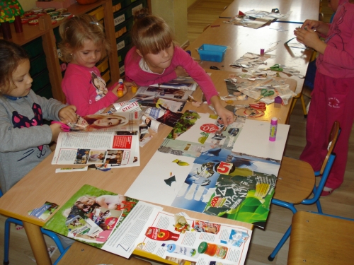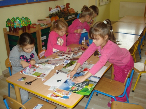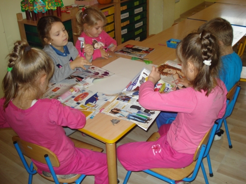 Podczas zajęć Klubu Bezpiecznego Przedszkolaka ze starych gazet wykleiliśmy skrzyżowanie ulic.
