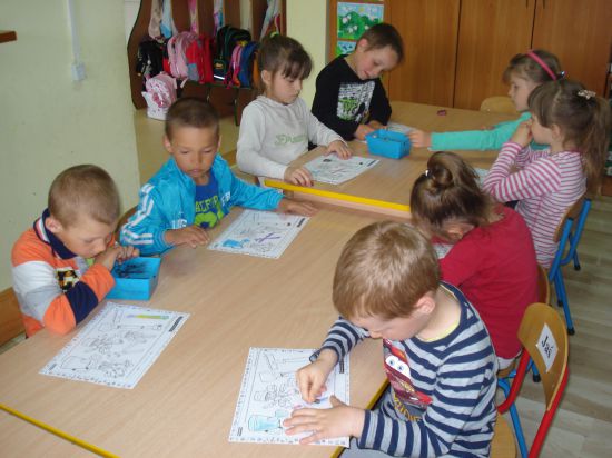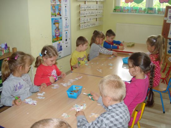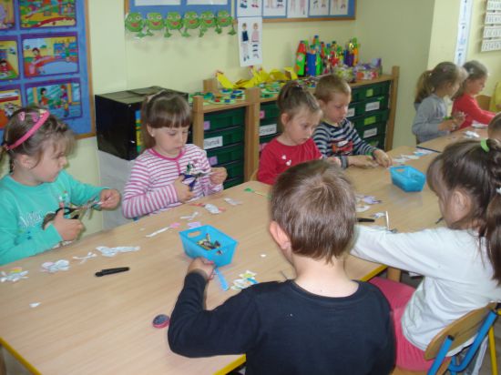 Pokolorowaliśmy narzędzia ogrodnicze, a następnie wycięliśmy je. Potem dzieliliśmy nazwy wyciętych narzędzi na sylaby, a ich sylwety przecinaliśmy na tyle części, ile mają sylab.