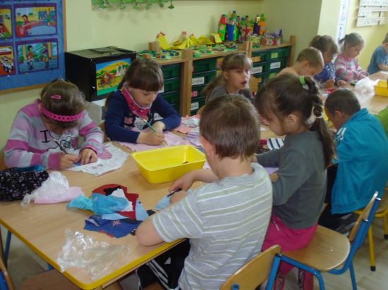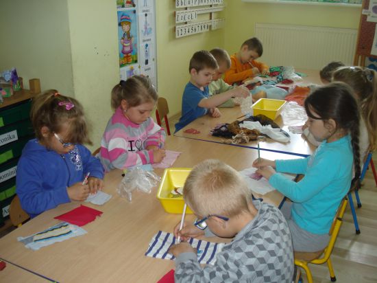 Z przyniesionych z domu skrawków materiałów wykonaliśmy własne projekty ubrań dla dziewczynki i chłopca.