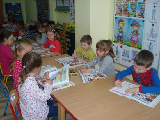 Podpisaliśmy obrazki przedstawiające osoby wykonujące różne zawody. Zastanawialiśmy się, jakie czynności wykonują te osoby oraz na czym polega ich praca.
