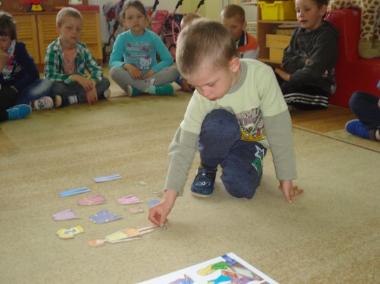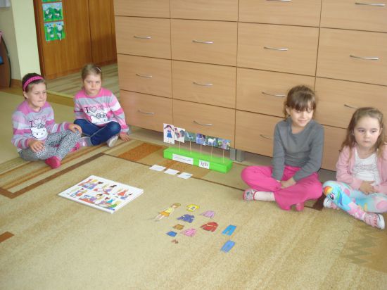 Wysłuchaliśmy teatrzyku sylwet na podstawie utworu J. Porazińskiej Jak szukano igiełki Hani?. Poznaliśmy pracę krawcowej oraz zastanawialiśmy się, w jakie ubrania ubierzemy papierową lalkę.