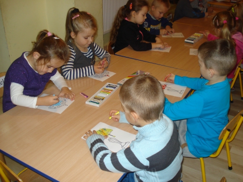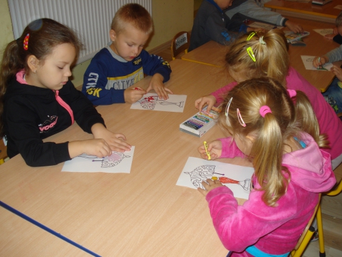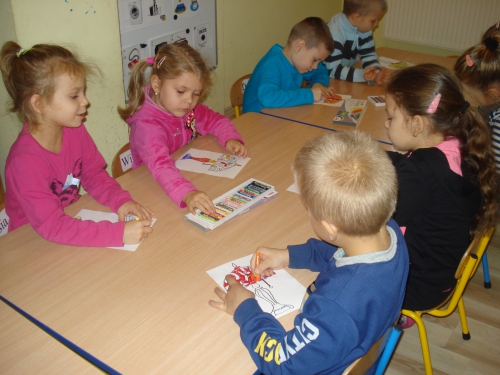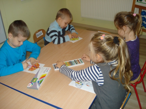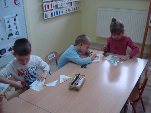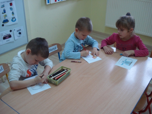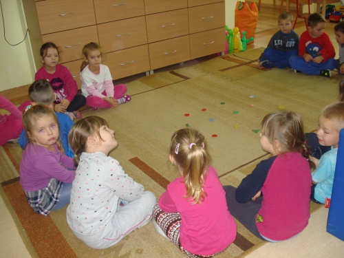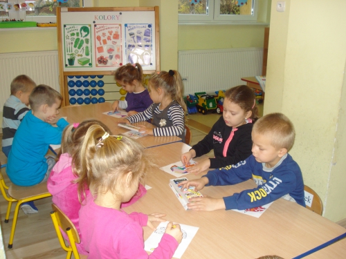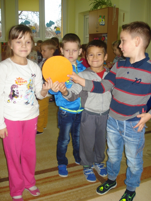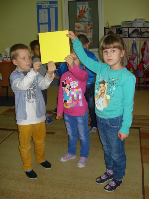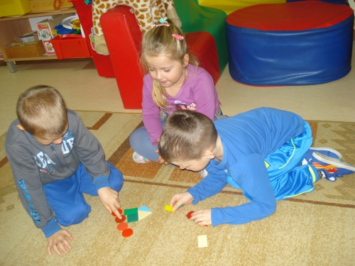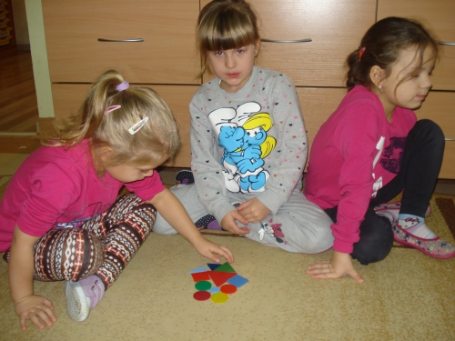 Poprzez zabawę utrwalaliśmy kolory oraz kształty figur geometrycznych.