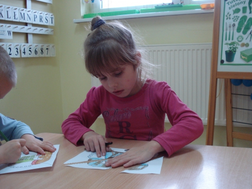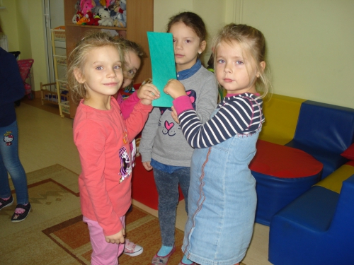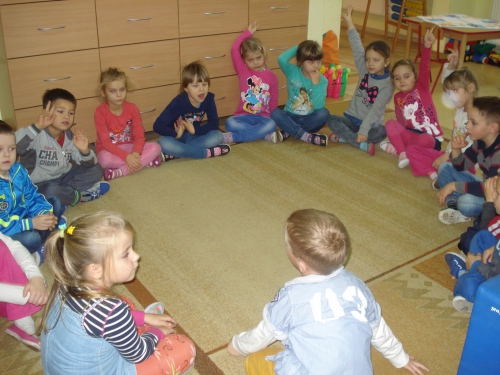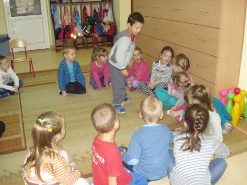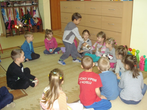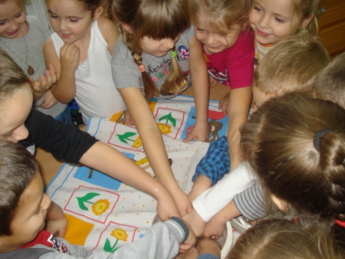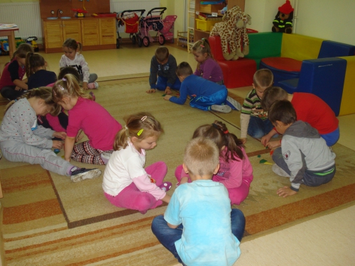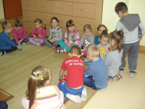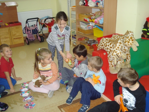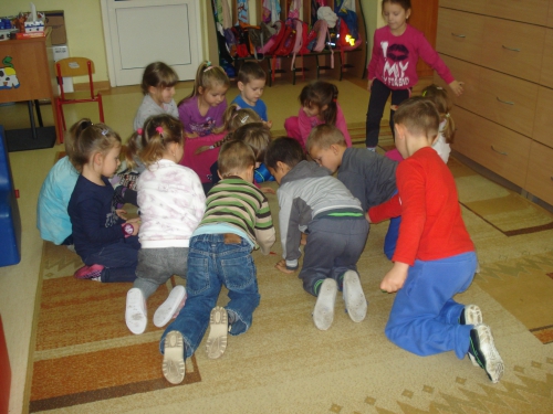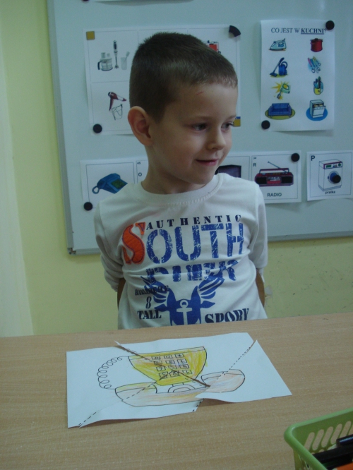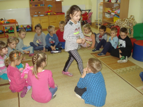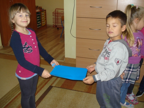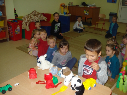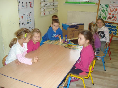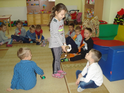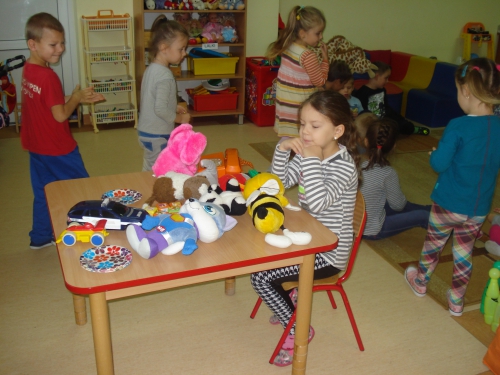 Poprzez zabawę "Doręcz przedmiot właścicielowi" rozwijaliśmy pamięć wzrokową. Wybrane z nas dziecko siedziało przy stoliku, a pozostałe kładły na stoliku wybrane przez nie przedmioty z sali. Dziecko siedzące przy stoliku musiało zapamiętać, kto i co położył. Jego zadaniem było doręczenie każdego przedmiotu do jego właściciela. Choć zabawa wydawała się trudna, doskonale sobie z nią poradziliśmy.