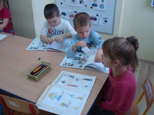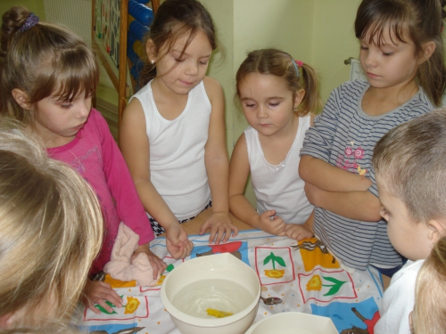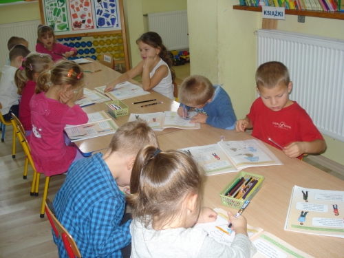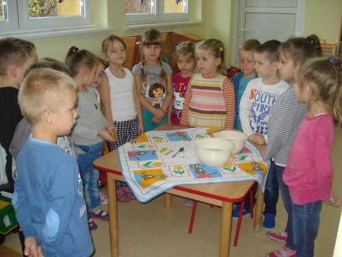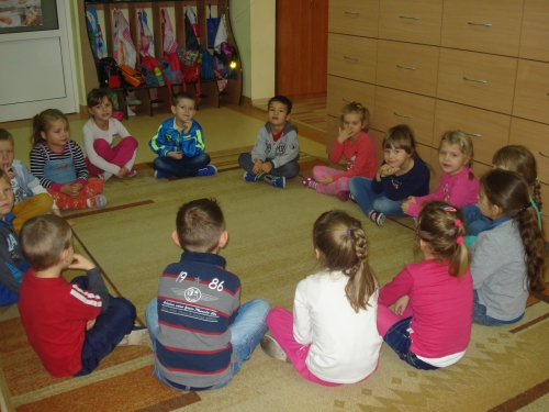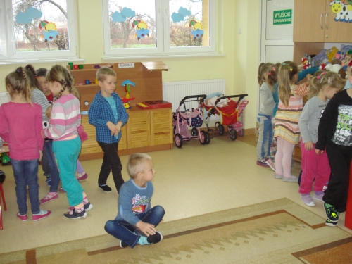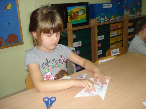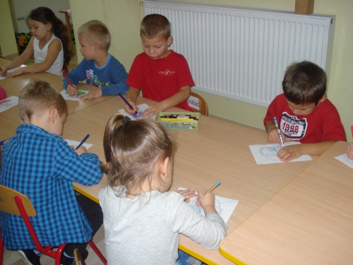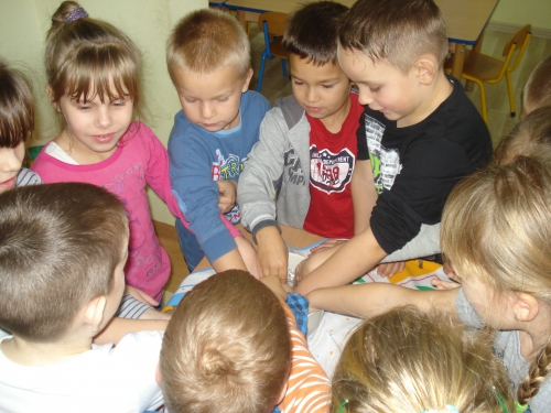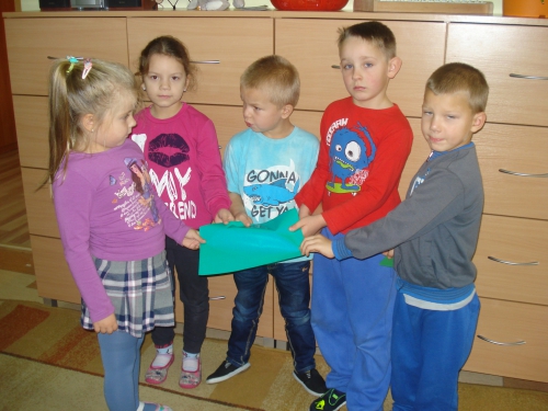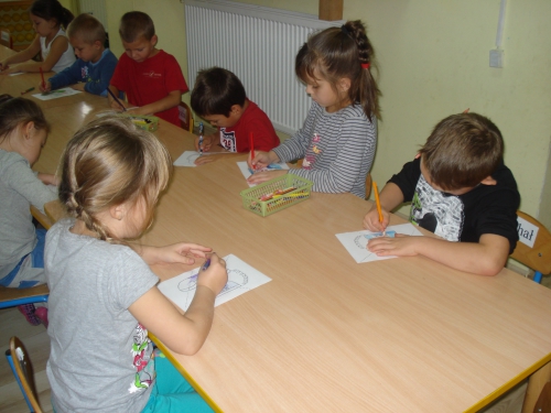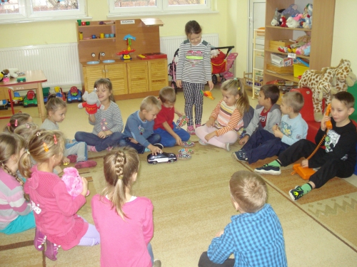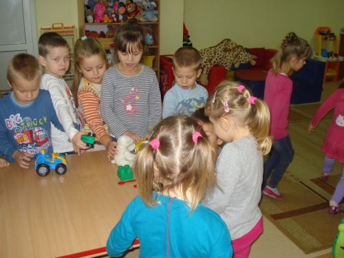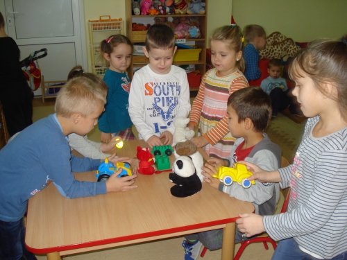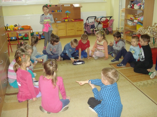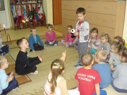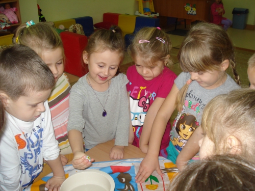 Poprzez zabawę "Doręcz przedmiot właścicielowi" rozwijaliśmy pamięć wzrokową. Wybrane z nas dziecko siedziało przy stoliku, a pozostałe kładły na stoliku wybrane przez nie przedmioty z sali. Dziecko siedzące przy stoliku musiało zapamiętać, kto i co położył. Jego zadaniem było doręczenie każdego przedmiotu do jego właściciela. Choć zabawa wydawała się trudna, doskonale sobie z nią poradziliśmy.
