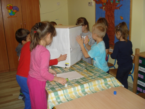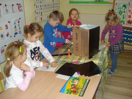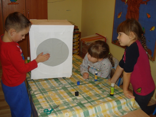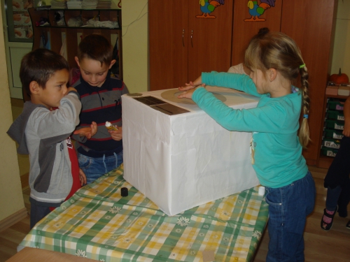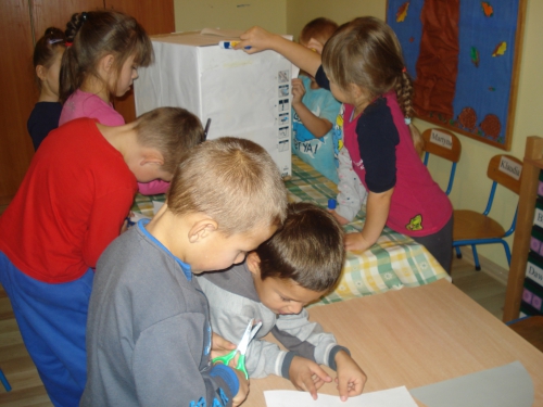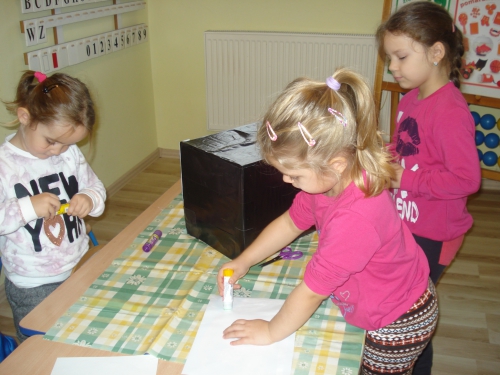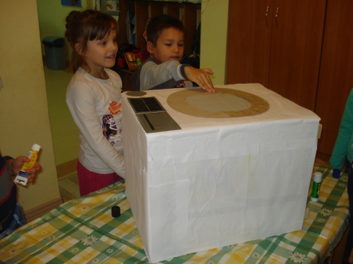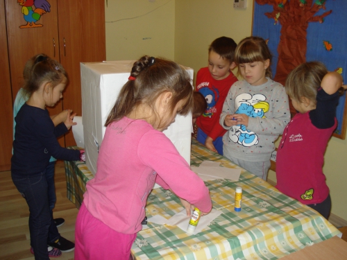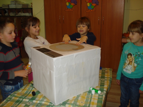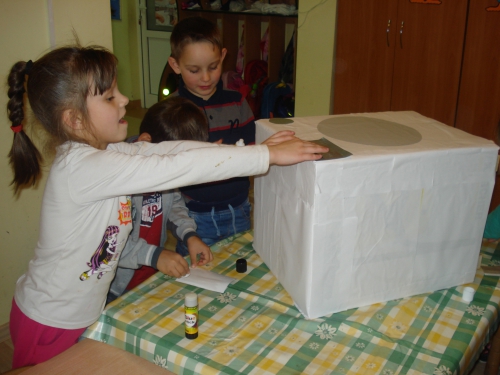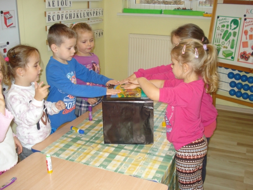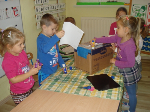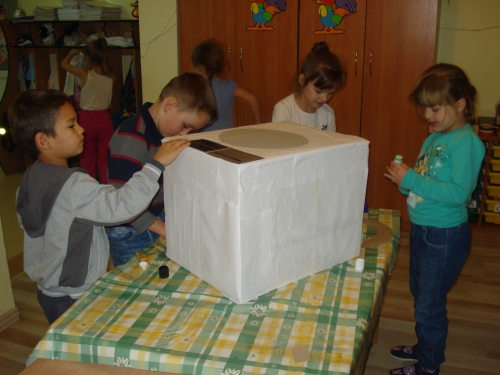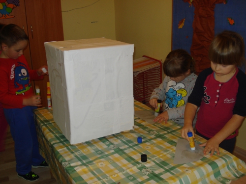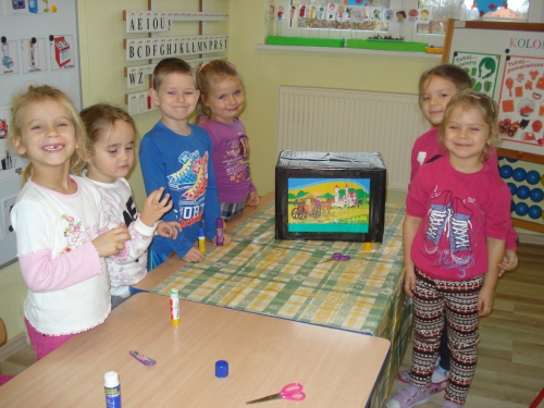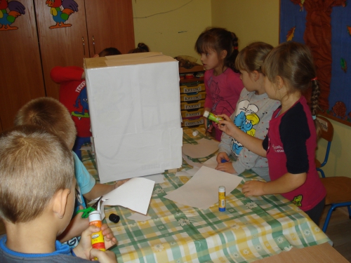 W dwóch grupach wykonaliśmy prace przestrzenne. Pierwsza grupa oklejała karton, tworząc telewizor.