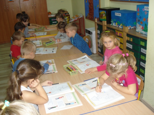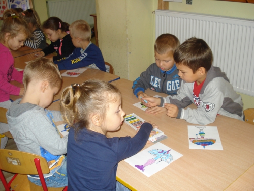 Następnie tworzyliśmy zbiory figur na podstawie jednej cechy- koloru. Porównywaliśmy również liczebność zbiorów.