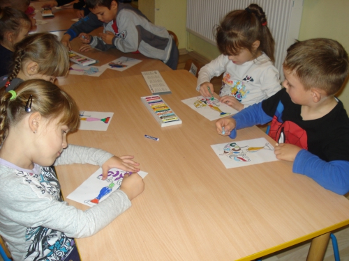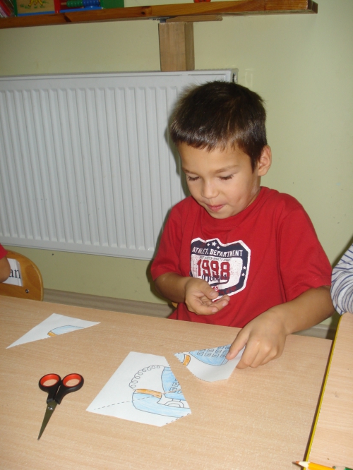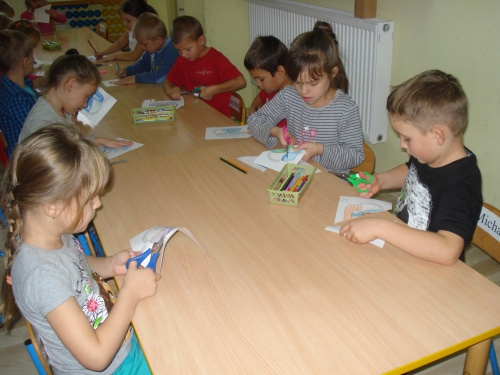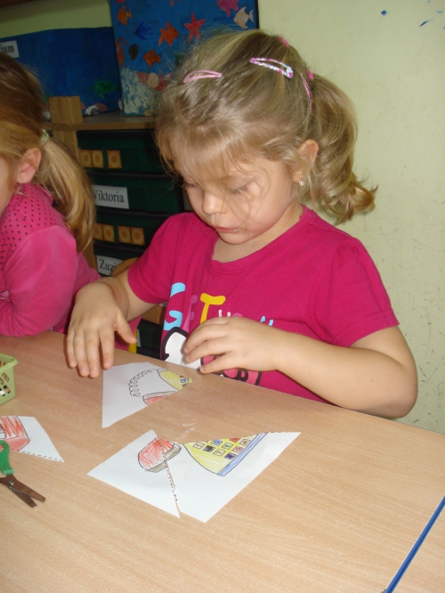 Kolorowaliśmy także rysunek telefonu stacjonarnego. Gotowe prace rozcinaliśmy wzdłuż linii, a z otrzymanych fragmentów obrazka układaliśmy całość.