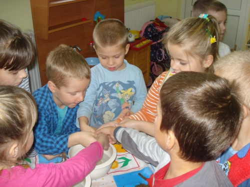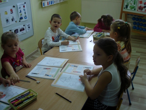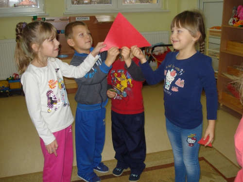 Potem podzieliliśmy się na pięć zespołów i układaliśmy z figur dowolne kompozycje.