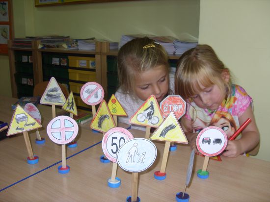 W czasie poniedziałkowych zajęć dzieci poznały zasady bezpiecznego poruszania się po drodze. Poznały również i wykonały podstawowe znaki drogowe.
