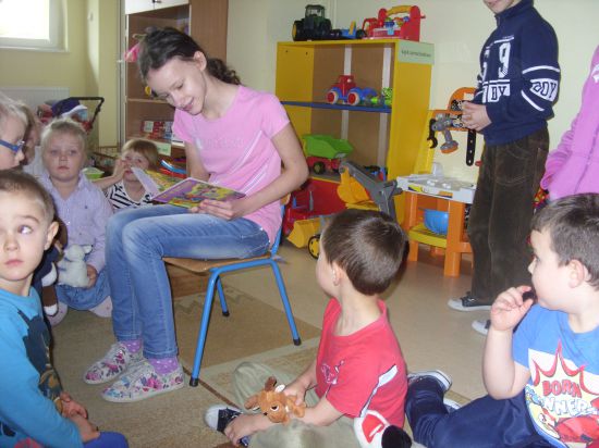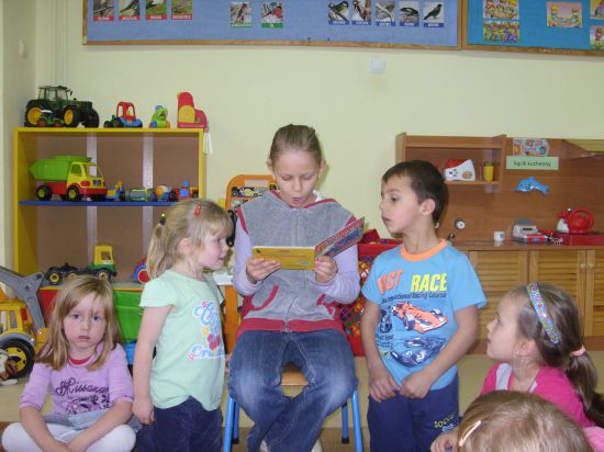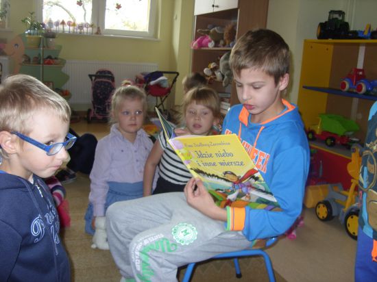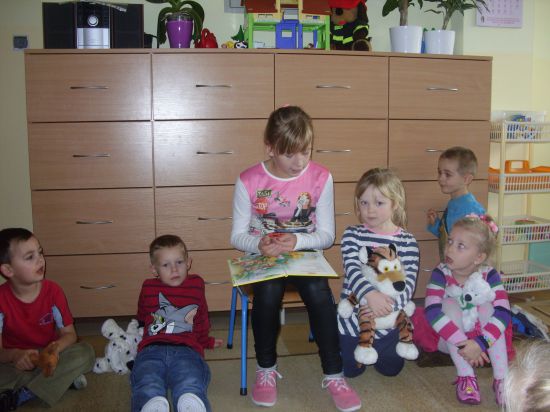 Rozumiejąc to i doceniając - nasze przedszkole przystąpiło do akcji "CAŁA POLSKA CZYTA DZIECIOM". W ramach realizowanego cyklu spotkań z książką wychowawczyni w trakcie poobiedniego odpoczynku , czyta dzieciom bajki. Raz w tygodniu do akcji włączają się rodzice, a w wolnej chwili na przerwie starsi koledzy. Przybliżyli oni przedszkolakom m. in. wiersze Juliana Tuwima, Jana Brzechwy, Ewy Szelburg - Zarembiny oraz inne bajki.