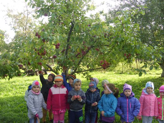 W czwartkowy poranek przedszkolaki wybrały się na spacer do sadu. Dzieci miały okazję zaobserwować jak wygląda sad jesienią, charakterystyczne drzewa (jabłonie, grusze, śliwy).