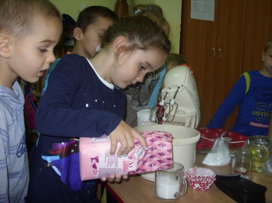 Przedszkolaki chętnie wsypywały mąkę, cukier i pozostałe składniki. Sprawiło im to ogromną radość.