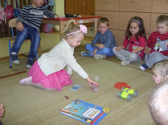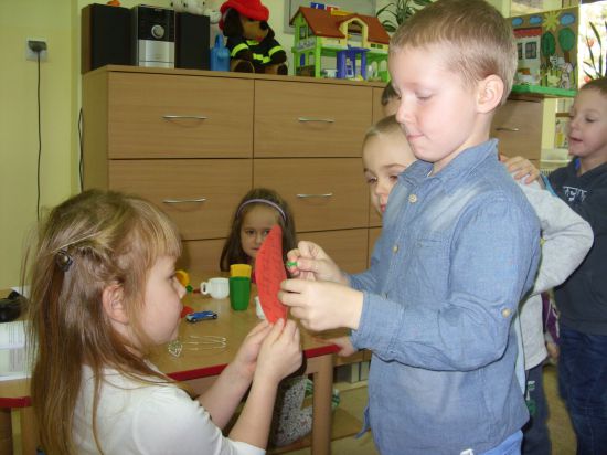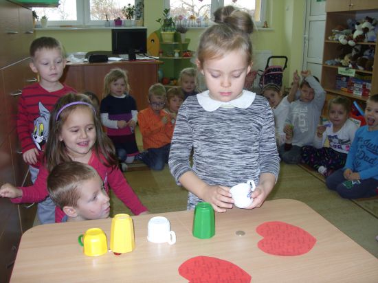 Przedszkolaki przekłuwały szpilką papierowe serca, na których wpisane były imiona dziewcząt i chłopców. Poznały w ten sposób imię swojej sympatii.