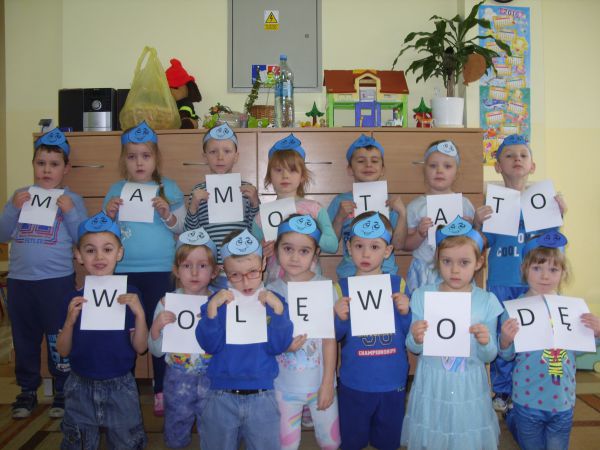Przedszkolaki dowiedziały się, że woda to dar natury, który pozwala nam żyć na Ziemi. Bez niej nie mogą żyć ani rośliny, ani zwierzęta, ani ludzie. Woda jest niezbędna do codziennego życia. Wody używamy do gotowania, podlewania, mycia, wytwarzania prądu elektrycznego, produkcji żywności i w przemyśle. Woda jest zasobem naturalnym, odnawialnym, ale również ograniczonym. Nieprawidłowe jej zużycie powoduje, że ulega zanieczyszczeniu i jest coraz mniej czystej wody.