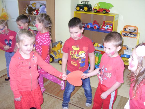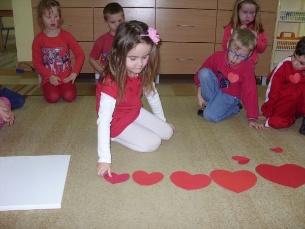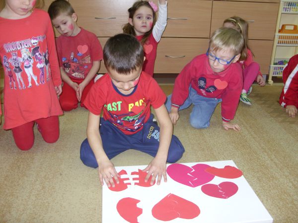 Dzieci wzięły udział w różnych zadaniach m.in. szukały drugiej połówki serca, układały serca od największego do najmniejszego, dmuchały na nie.
