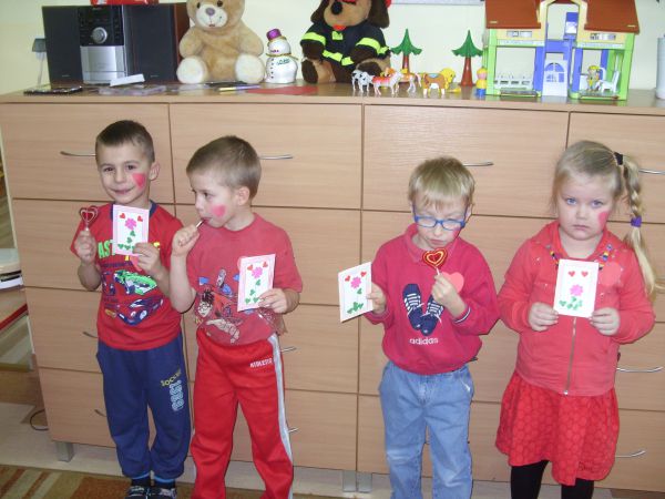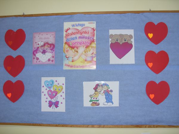 W miniony piątek dzieci z oddziału przedszkolnego świętowały Walentynki. Wszystkie przedszkolaki tego dnia ubrały się na czerwono i tym samym zapoczątkowały dzień milych wrażeń. Na początku odbyła się pogadanka na temat zwyczaju walentynkowego, historii i tradycji obchodzenia "Dnia św. Walentego" - patrona zakochanych. Dzieci wypowiadały się na temat okazywania miłości bliskim osobom. Wysłuchaly również wierszyka "Walentynki".