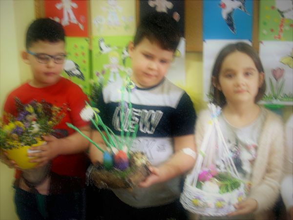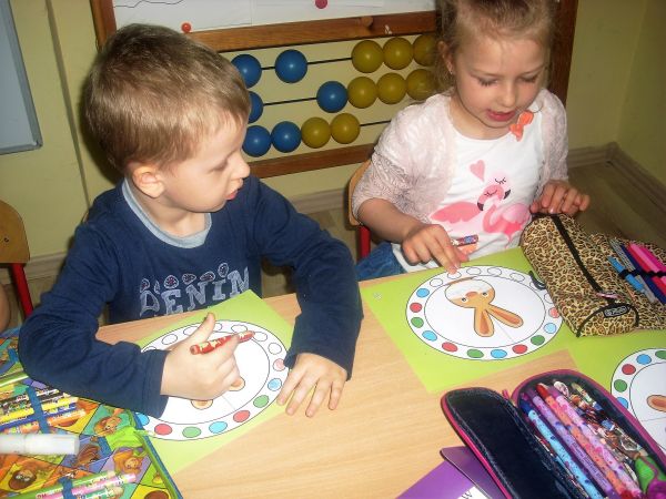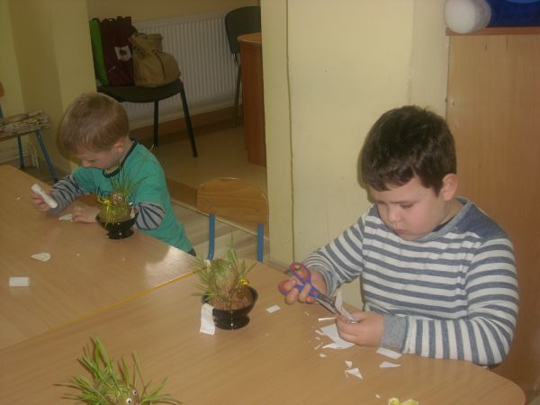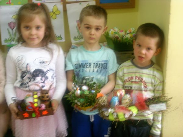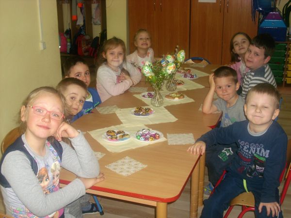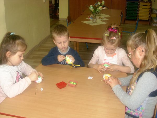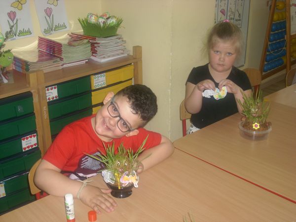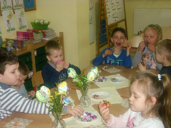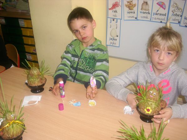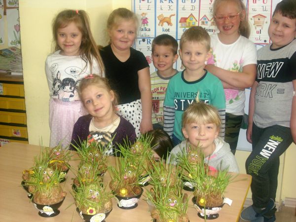 Dzieci z oddziału przedszkolnego poznały zwyczaje i tradycje wielkanocne. Podczas kolejnych zajęć poznały czynności wykonywane przed świętami oraz produkty z koszyczka wielkanocnego. Wszyscy wykonali własnoręcznie piękne dekoracje: zbożowego ludzika