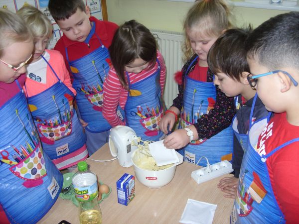 W walentynkowy poranek dzieci z oddziału przedszkolnego postanowiły przygotować słodki upominek dla starszych kolegów i koleżanek. Wspólnie ukręciły waniliowe ciasto, rozłożyły do foremek i posypały gorzką czekoladą.