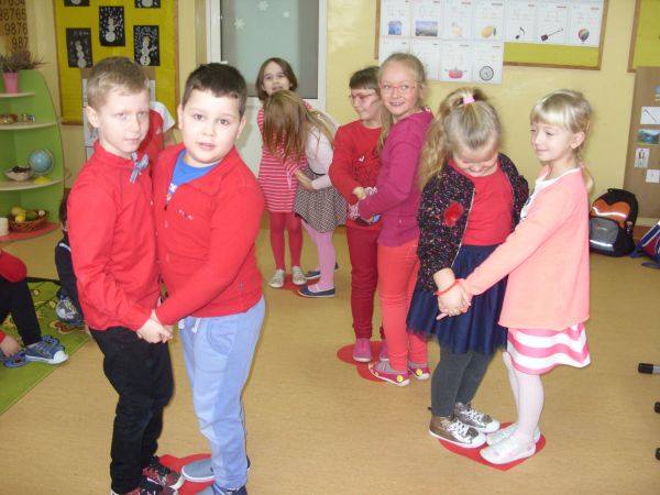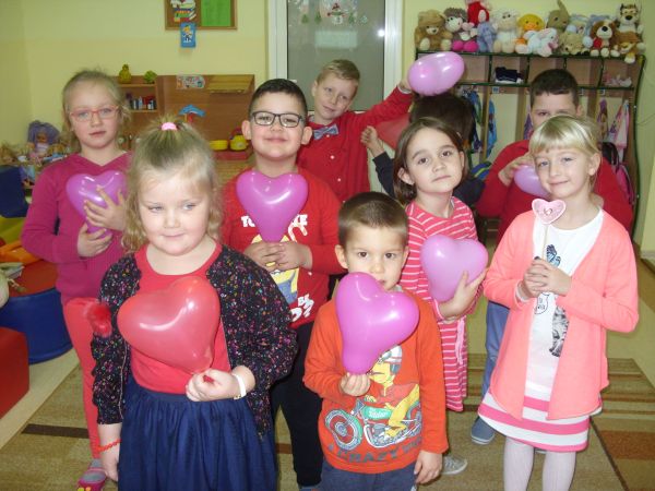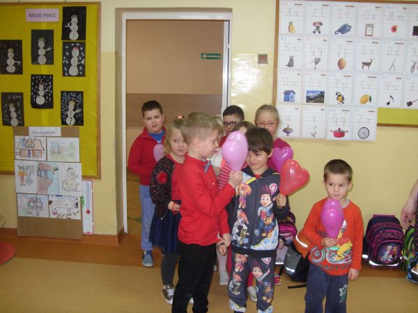 Następnie nadmuchały baloniki w kształcie serca i z upieczonymi babeczkami poszły na walentynkowy bal do przyjaciół z klasy I.