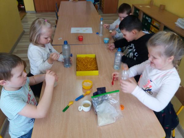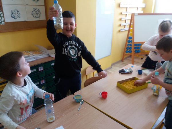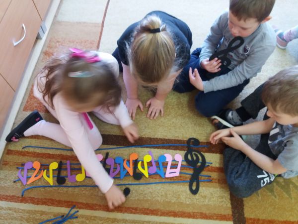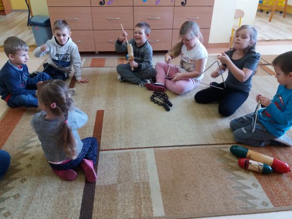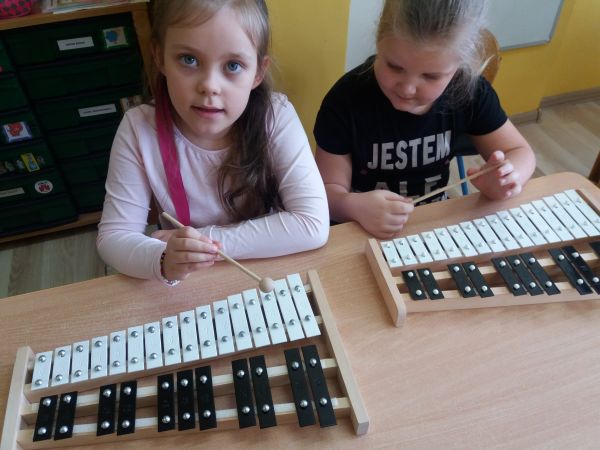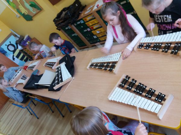 Tydzień z muzyką był pełen muzycznych doświadczeń. Poznawaliśmy różne instrumenty, graliśmy na nich, poznawaliśmy alfabet muzyczny, robiliśmy własne instrumenty z butelek i materiałów sypkich, graliśmy w dźwiękowe memo z jajek niespodzianek, śpiewaliśmy, tańczyliśmy, utrwalaliśmy nawet literki z pomocą dzwonków chromatycznych.