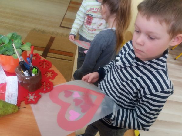 Przygotowania do Walentynek w przedszkolu idą pełną parą. Dzisiaj wiszą już walentynkowe witraże.