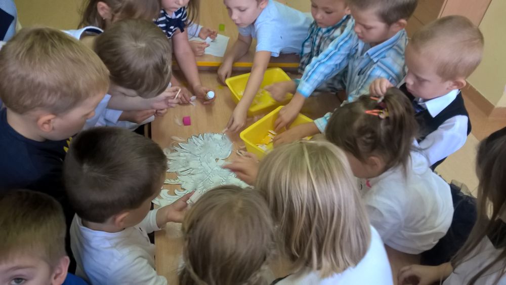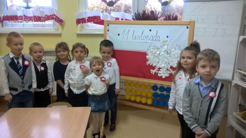 Cała grupa wykleiła filcem oraz białymi piórami sylwetę białego orła. Wspólnie wykonaliśmy gazetkę tematyczną pod nazwą „11 listopada”.