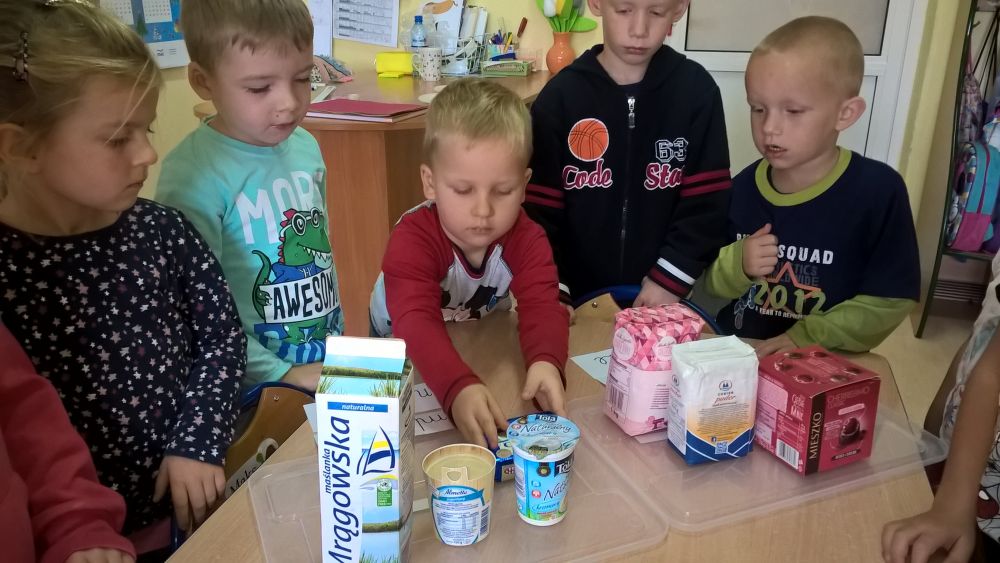 Wyjaśnialiśmy pojęcia: „słodycze” i „produkty mleczne”. Dowiedzieliśmy się, z czego powstaje cukier. Czytaliśmy nowo poznane pojęcia, dzieliliśmy je na sylaby i głoski. Liczyliśmy ilość sylab i głosek, a także podawaliśmy pierwsze i ostatnie głoski. Grupowaliśmy produkty spożywcze według surowca, z którego zostały wykonane.