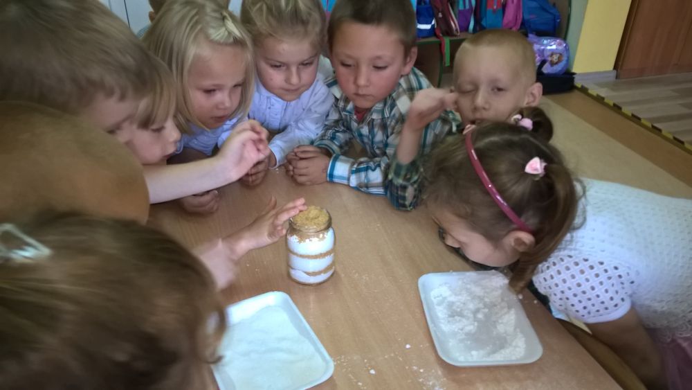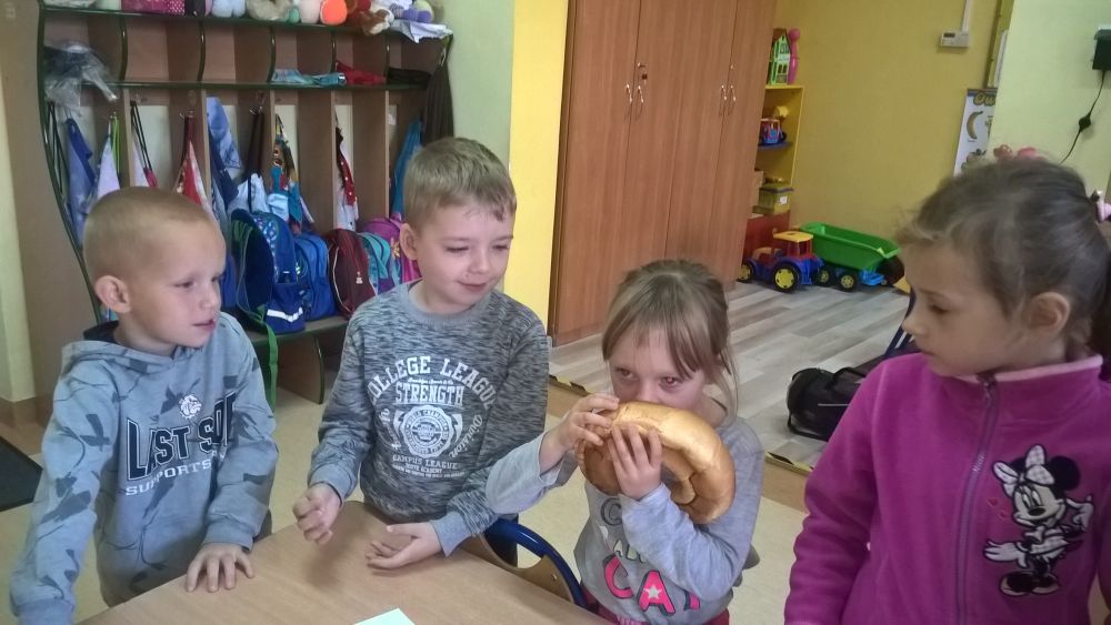 Podczas zajęć badawczych dowiedzieliśmy się, z czego robi się chleb. Opowiadaliśmy historyjkę obrazkową o powstawaniu chleba. Poznaliśmy rodzaje pieczywa, ich zapach, wygląd oraz smak, a także rodzaje ziaren i powstałe z nich mąki.