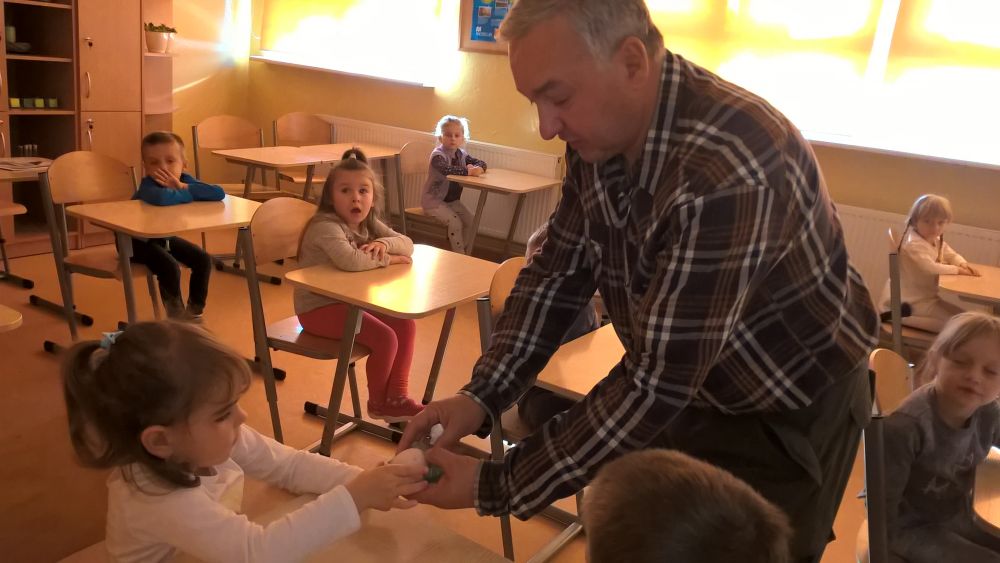 Mieliśmy możliwość przyjrzeć się z bliska ptasim piórom, składanym przez ptaki jajom oraz budowanym przez nie gniazdom. Ornitolog opowiadał o tym, z czego zbudowane jest ptasie jajo. Pokazał nam także jajko zatopione w occie, który rozpuścił skorupę, a jajko stało się sprężyste i miękkie.
