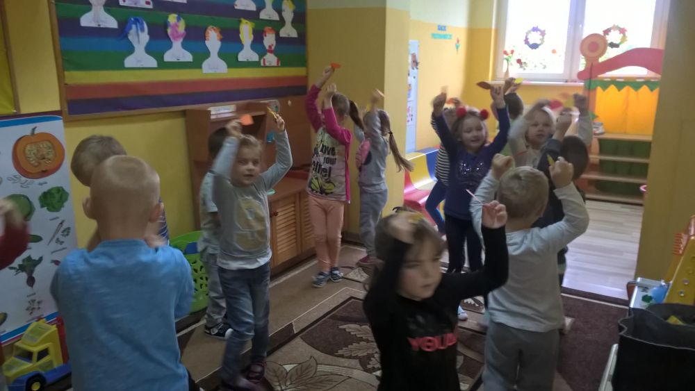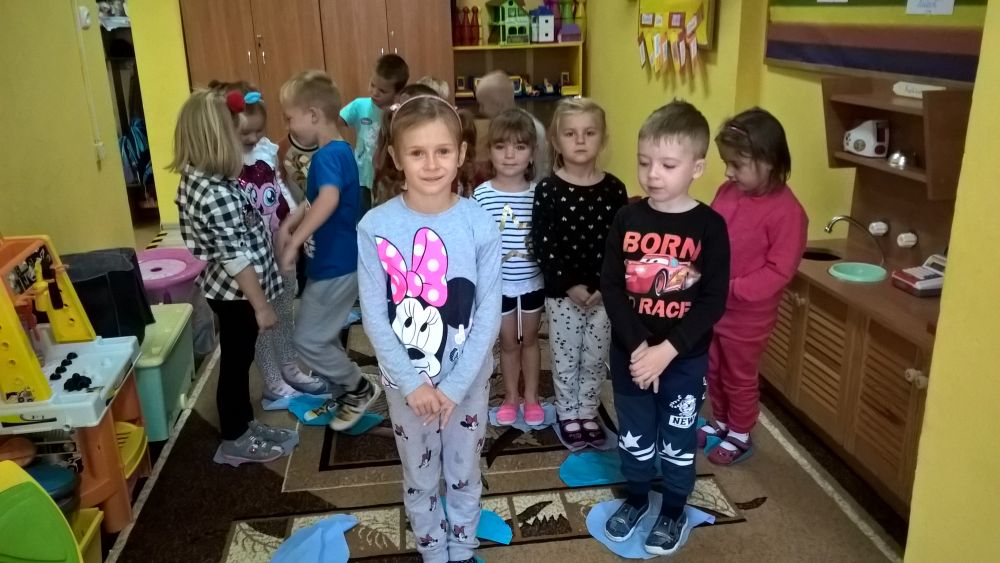 Wykonywaliśmy polecenia nauczyciela podczas zabawy „Skok przez kałuże”.