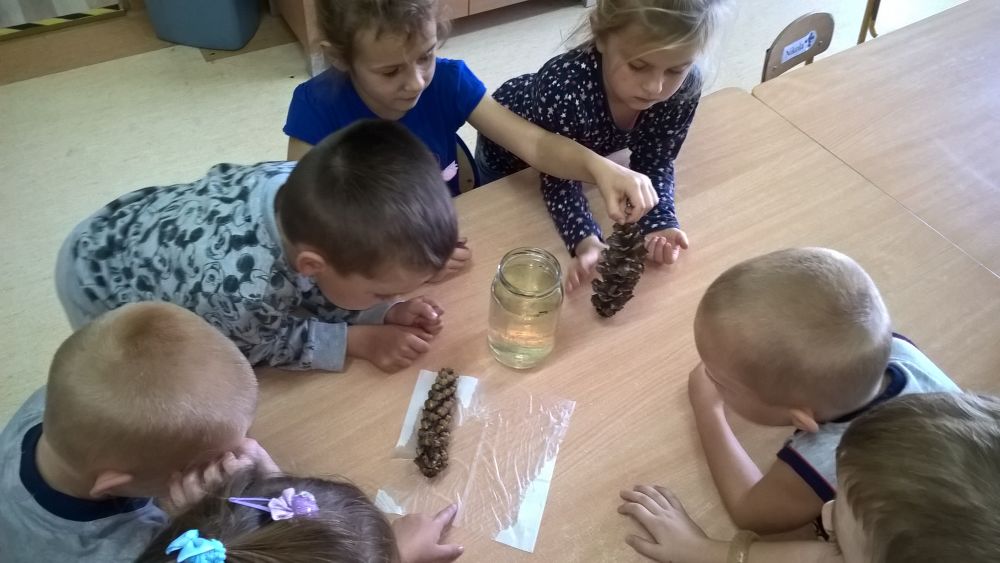 Wspólnie opisywaliśmy wygląd szyszki i wykonaliśmy doświadczenie z jej użyciem.